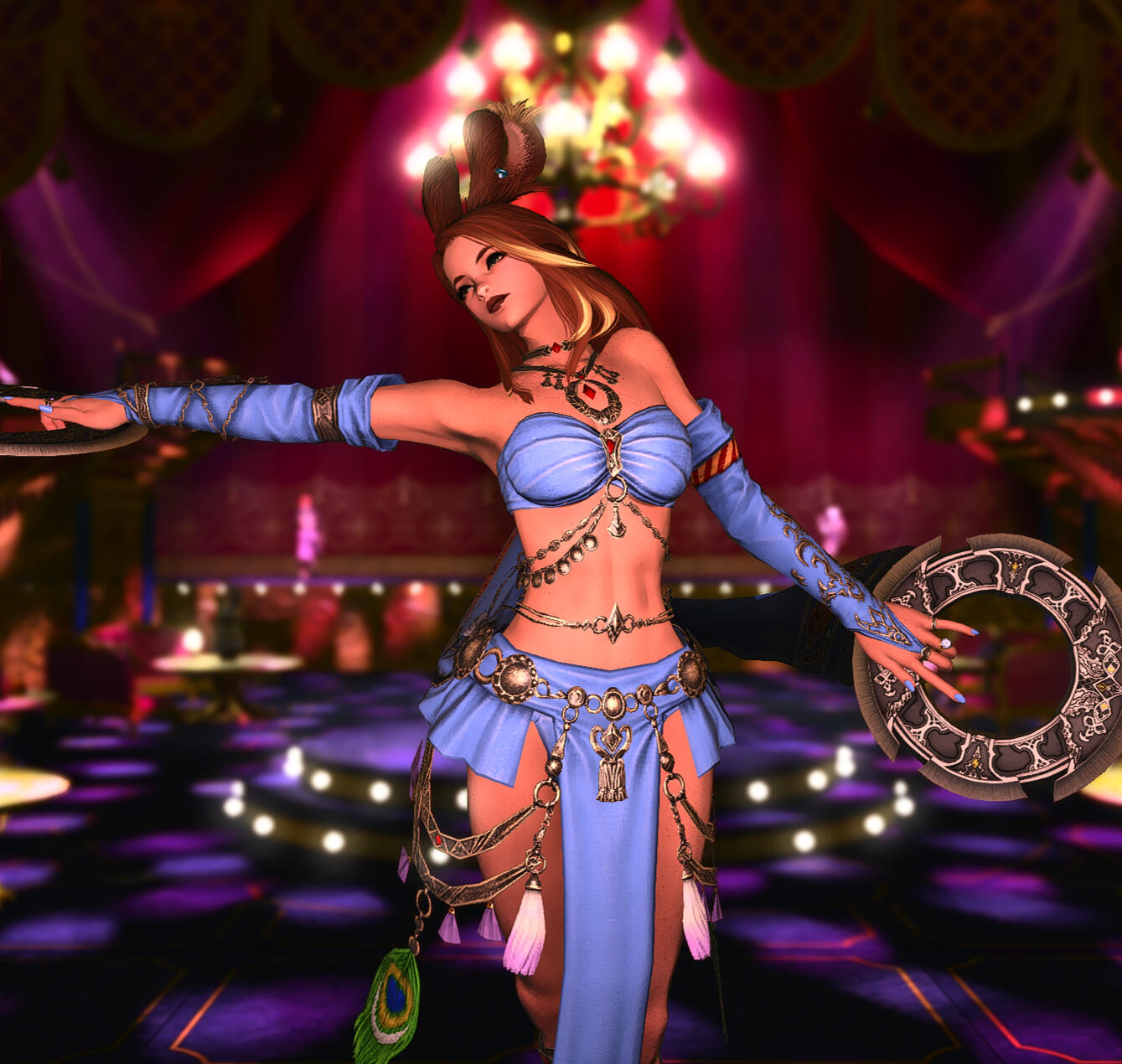 Soon after arriving in Kugane, Sylvas was enthralled by the performing arts. Festivals, parades, and shows frequently lined the streets of the city. This soon inspired her to take up the art of dance herself. She began with lessons when she was younger and soon found herself joining a troupe that she would travel and perform with for nearly a decade. Though her time with the troupe lately has been limited, Sylvas will never give up her love for dance and the performing arts.
